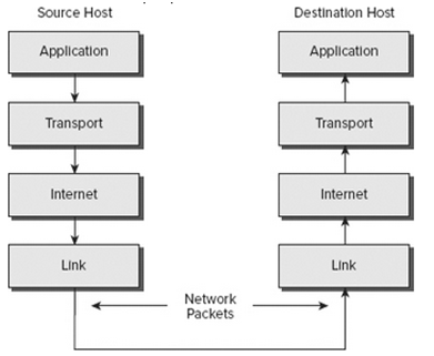In case an application like an FTP application is called, the application travels down through the layers and retrieval of TCP takes place. TCP then sets up a connection with IP protocol and enters the network through the Link Layer. This being a connection oriented protocol, delivery of the message is guaranteed.